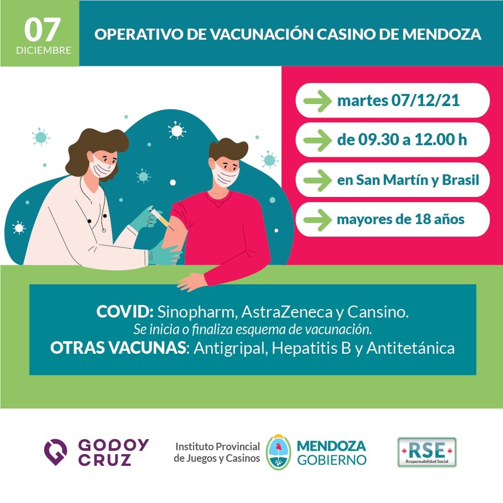 El próximo Martes 7 de diciembre, en el marco de la campaña del Departamento de Responsabilidad Social del Instituto Provincial de Juegos y Casinos “+prevención +vida”, se llevará a cabo una campaña de vacunación junto al área de salud de la Municipalidad de Godoy Cruz en la puerta del Casino de Mendoza. Durante la jornada, de 9.30 a 12.30 hs, aquellos mayores de 18 años que pasen por la puerta del Casino de Mendoza podrán vacunarse contra el Covid 19 (Sinopharm, AstraZeneca y Cansino) iniciando o finalizando su esquema de vacunación. Además, se podrá acceder a las vacunas antigripal, hepatitis B y antitetánica.